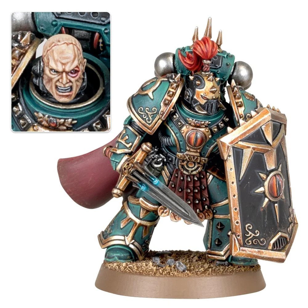 His miniature is one of the most recent additions to the Sons of Horus range and its gorgeous, He is commonly used to convert other characters such as champions or praetors and is just overall a great mini, his face looks about as disgusting as you would imagine someone who needed it stitched back on in a hurry would look, my only complaint is his sword is definitely the least impressive sword in the legion, missing the over the top serrated edges or hooks most other sons of horus weapons have.